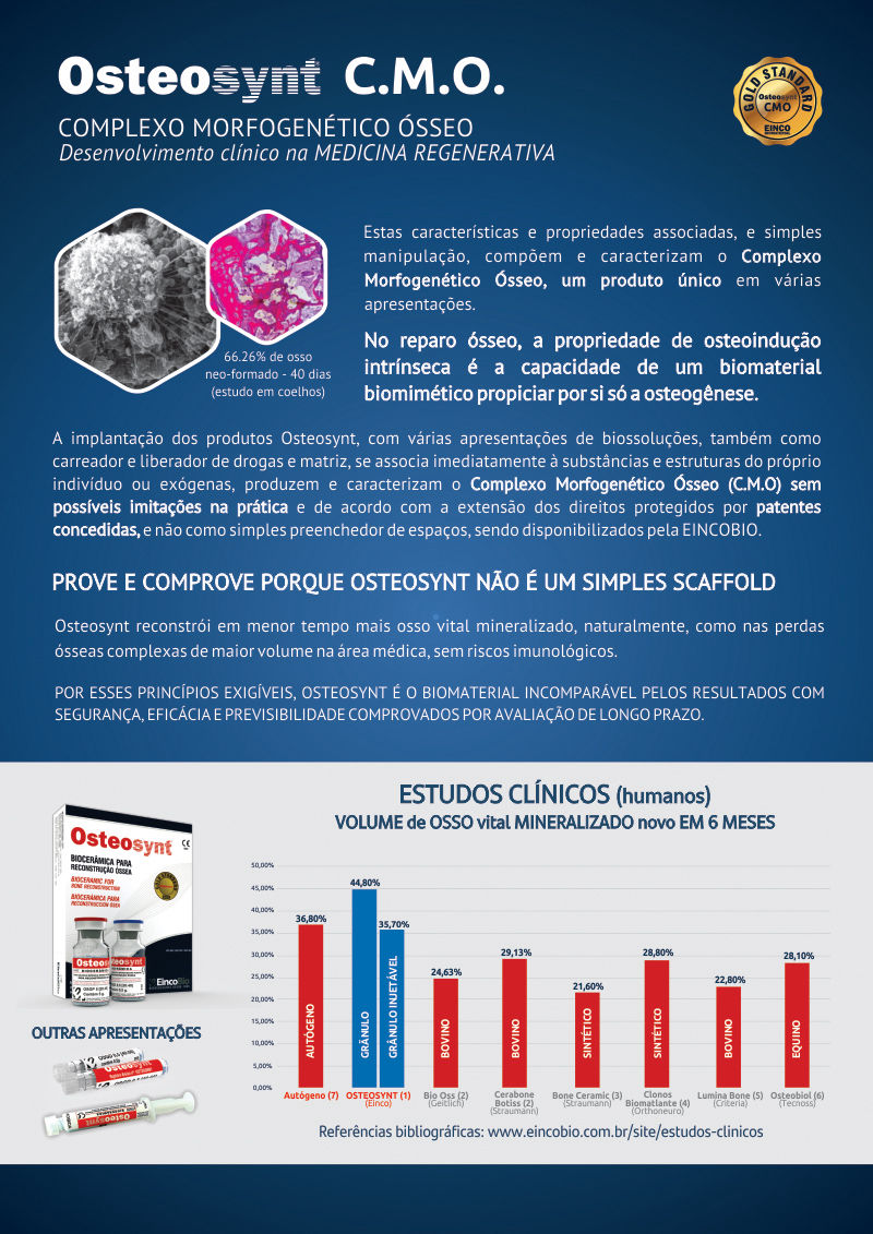 O Osteosynt C.M.O.® é um enxerto ósseo biocerâmico de última geração, composto por uma matriz fosfocálcica bioativa (hidroxiapatita e fosfato tricálcico) que mimetiza a estrutura mineral óssea. Desenvolvido para regeneração e reconstrução óssea, oferece osteoindução intrínseca, biocompatibilidade e reabsorção controlada, eliminando a necessidade de enxertos autólogos e reduzindo riscos de infecção. Ideal para diversas especialidades médicas, como Ortopedia, Odontologia e Neurocirurgia, com resultados comprovados em mais de 400.000 casos clínicos.